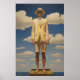 Una representación surrealista y elegante de un hombre vestido con un traje de playa de inspiración vintage, con un parloteo de rayas amarillas y blancas con pantalones cortos a juego, un cuello de tortuga a rayas, gafas de sol y un gorra de gran formato. La escena se sitúa contra un vibrante cielo azul lleno de nubes esponjosas que evocan una estética nostálgica de verano. La composición artística combina elementos de surrealismo e hiperrealismo, convirtiéndola en una imagen visualmente cautivadora y vanguardista.