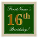 Este sencillo y elegante diseño de poster para fiestas de cumpleaños incluye un mensaje personalizado como "¡16º cumpleaños de FirstName!" (con el "16º" con un aspecto de color falso/imitación de oro) dentro de un área cuadrada de color verde con un sencillo contorno fronterizo. El nombre se encuentra en un texto elegante de color blanco tipo script, y se puede personalizar. Un poster de fiesta de cumpleaños personalizado como este podría ser usado como decoración en un fiesta que está siendo retenido por alguien que está celebrando su decimosexto cumpleaños. [~Z0000235]