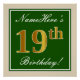 Este sencillo y elegante diseño de poster para fiestas de cumpleaños incluye un mensaje personalizado como "¡Nombre, este es el cumpleaños número 19!" (el "decimonoveno" tiene un aspecto de color falso/imitación de oro) dentro de un área cuadrada de color verde con un sencillo contorno fronterizo. El nombre se encuentra en un texto elegante de color blanco tipo script, y se puede personalizar. Un poster de fiesta de cumpleaños personalizado como este podría ser usado como decoración en un fiesta que está siendo retenido por alguien que está celebrando su decimonoveno cumpleaños. [~Z0000235]