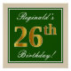Este sencillo y elegante diseño de poster de cumpleaños incluye un mensaje personalizado como "¡Cumpleaños 26 de Reginald!" (con el "26º" con un aspecto de color falso/imitación dorado) dentro de un área cuadrada de color verde con un sencillo contorno fronterizo. El nombre se encuentra en un texto elegante de color blanco tipo script, y se puede personalizar. Un poster de fiesta de cumpleaños personalizado como este podría ser usado como decoración en un fiesta que está siendo retenido por alguien que está celebrando su vigésimo sexto cumpleaños. [~Z0000235]