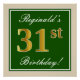Este sencillo y elegante diseño de poster para fiestas de cumpleaños incluye un mensaje personalizado como "¡Cumpleaños 31 de Reginald!" (el "31" tiene un aspecto de color falso/imitación de oro) dentro de un área cuadrada de color verde con un sencillo contorno fronterizo. El nombre se encuentra en un texto elegante de color blanco tipo script, y se puede personalizar. Un poster de fiesta de cumpleaños personalizado como este podría ser usado como decoración en un fiesta que está siendo retenido por alguien que está celebrando su 31º cumpleaños. [~Z0000235]
