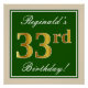 Este sencillo y elegante diseño de poster para fiestas de cumpleaños incluye un mensaje personalizado como "¡33 cumpleaños de Reginald!" (el "33" tiene un aspecto de color falso/imitación de oro) dentro de un área cuadrada de color verde con un sencillo contorno fronterizo. El nombre se encuentra en un texto elegante de color blanco tipo script, y se puede personalizar. Un poster de fiesta de cumpleaños personalizado como este podría ser usado como decoración en un fiesta que está siendo retenido por alguien que está celebrando su 33 cumpleaños. [~Z0000235]