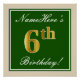 Este sencillo y elegante diseño de poster para fiestas de cumpleaños incluye un mensaje personalizado como "¡Nombra al sexto cumpleaños de aquí!" (con el "sexto" con un aspecto de color falso/imitación de oro) dentro de un área cuadrada de color verde con un simple contorno fronterizo. El nombre se encuentra en un texto elegante de color blanco tipo script, y se puede personalizar. Un poster de fiesta de cumpleaños personalizado como este podría ser usado como decoración en un fiesta que está siendo retenido por alguien que está celebrando su sexto cumpleaños. [~Z0000235]