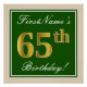 Este sencillo y elegante diseño de poster para fiestas de cumpleaños incluye un mensaje personalizado como "¡Cumpleaños 65 de FirstName!" (con el "65" con un aspecto de color falso/imitación de oro) dentro de un área cuadrada de color verde con un sencillo contorno fronterizo. El nombre se encuentra en un texto elegante de color blanco tipo script, y se puede personalizar. Un poster de fiesta de cumpleaños personalizado como este podría ser usado como decoración en un fiesta que está siendo retenido por alguien que está celebrando su sexagésimo quinto cumpleaños. [~Z0000235]