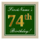 Este sencillo y elegante diseño de poster de cumpleaños incluye un mensaje personalizado como "¡Cumpleaños 74 de FirstName!" (con el "74″ con un aspecto de color falso/imitación de oro) dentro de un área cuadrada de color verde con un sencillo contorno fronterizo. El nombre se encuentra en un texto elegante de color blanco tipo script, y se puede personalizar. Un poster de fiesta de cumpleaños personalizado como este podría ser usado como decoración en un fiesta que está siendo retenido por alguien que está celebrando su cumpleaños setenta y cuatro. [~Z0000235]