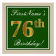 Póster Elegante, verde, falso oro 76 cumpleaños + nombre