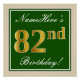 Este sencillo y elegante diseño de poster para fiestas de cumpleaños incluye un mensaje personalizado como "¡Nombre, cumpleaños número 82!" (el "82" tiene un aspecto de color falso/imitación de oro) dentro de un área cuadrada de color verde con un sencillo contorno fronterizo. El nombre se encuentra en un texto elegante de color blanco tipo script, y se puede personalizar. Un poster de fiesta de cumpleaños personalizado como este podría ser usado como decoración en un fiesta que está siendo retenido por alguien que está celebrando su cumpleaños número ochenta. [~Z0000235]