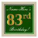 Este sencillo y elegante diseño de poster para fiestas de cumpleaños incluye un mensaje personalizado como "¡Nombra al 83 cumpleaños!" (con el "83" con un aspecto de color falso/imitación de oro) dentro de un área cuadrada de color verde con un sencillo contorno fronterizo. El nombre se encuentra en un texto elegante de color blanco tipo script, y se puede personalizar. Un poster de fiesta de cumpleaños personalizado como este podría ser usado como decoración en un fiesta que está siendo retenido por alguien que está celebrando su cumpleaños número ochenta. [~Z0000235]