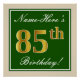 Este sencillo y elegante diseño de poster para fiestas de cumpleaños incluye un mensaje personalizado como "¡Cumpleaños 85!" (el "85" tiene un aspecto falso/imitación de color dorado) dentro de un área cuadrada de color verde con un sencillo contorno fronterizo. El nombre se encuentra en un texto elegante de color blanco tipo script, y se puede personalizar. Un poster de fiesta de cumpleaños personalizado como este podría ser usado como decoración en un fiesta que está siendo retenido por alguien que está celebrando su 85º cumpleaños. [~Z0000235]