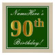 Este sencillo y elegante diseño de poster para fiestas de cumpleaños incluye un mensaje personalizado como "¡El 90 aniversario de Name Here's 90th Birthday!" (con el "90th" con un toque de color falso/imitación de oro) dentro de un área cuadrada de color verde con un sencillo contorno fronterizo. El nombre se encuentra en un texto elegante de color blanco tipo script, y se puede personalizar. Un poster de fiesta de cumpleaños personalizado como este podría ser usado como decoración en un fiesta que está siendo retenido por alguien que está celebrando su cumpleaños número noventa. [~Z0000235]
