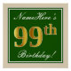 Póster Elegante, verde, falso oro 99º cumpleaños + nombre