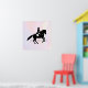 Un poster con un ilustracion blanco y negro de un jinete. El caballo y el jinete están tocando una pirueta. Elegante y hermoso. Colocado en un fondo acuático de colores pastel delicados y mullidos.