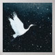 Graciosamente, la grúa blanca minimalista se eleva a través de una tormenta de nieve en invierno.