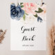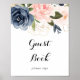 Este elegante y simple letrero de libro de invitados floral de invierno es perfecto para una boda moderna o una despedida de soltera. El diseño presenta hermosas flores de color azul oscuro, azul, navy, rosa, dorado y follaje verde pintadas a mano, agrupadas en elegantes ramos.