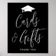 Signo moderno de la fiesta de graduación con un ilustracion de un gorro blanco de graduación en la parte superior con "Tarjetas y Regalos" mostrados en un guión de caligrafía blanca sobre un fondo negro (o color de su elección). Personalice el poster de graduación en blanco y negro con el texto de su personalizado en la parte inferior (actualmente se muestra con "Gracias"). El cartel de la fiesta de graduación es perfecto tanto para graduados de secundaria como universitarios.