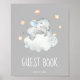 Este letrero de libro de visitas para niños con duchas grises es perfecto para un simple boda. El moderno diseño cuenta con un moderno y bonito animal acuático de safari zoo durmiendo en una suave nube con estrellas amarillas brillantes.