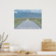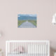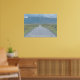 Arte mural inspirador que presenta el texto "Elige una dirección totalmente propia" contra una carretera de una sola vía que conduce a montañas cubiertas de nubes.