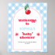 ¡Bienvenido a sus fiestas invitados con este dulce poster de ducha de bebé "Cherry on Top"! Con una temática de cerezo caprichosa, una tipografía de inspiración retro y un suave borde azul de gingham, este encantador poster le da la tónica perfecta para una cálida bienvenida a la celebración.