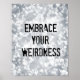 Funny Motivational Quote: Embrace your weirdness prints and posters. This print features a black and white pattern with bokeh sparkles (which can be removed for a simple quote only poster).