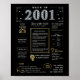Recorra el año 2001 con nuestro cautivador poster digital de cumpleaños, lleno de hechos históricos, acontecimientos significativos y narrativas cautivadoras del pasado. Este poster de cumpleaños, adornado con elegantes acentos dorados y plateados con un impresionante telón de fondo negro, irradia un encanto atemporal. Nuestro poster de cumpleaños ofrece un intrigante vistazo al 2001, ahondando en aspectos como el ingreso promedio, invenciones notables, sucesos significativos, tendencias de moda y expresiones coloquiales de la época. Destaca momentos clave como la llegada de las plataformas de medios sociales, el surgimiento de la televisión real y el surgimiento de servicios de transmisión en streaming. Inventos como los teléfonos inteligentes, los teléfonos con cámara y los autos híbridos ocupan el centro del escenario, lo que refleja los notables avances tecnológicos de la época. En general, el poster de cumpleaños capta la esencia de la vida en la década de 2000, encapsulando tanto la innovación tecnológica como los fenómenos culturales como la música y la moda. Sirve como un cautivador comienzo de conversación en celebraciones de cumpleaños y aniversarios, y cuando se enmarca elegantemente, se transforma en un apreciado recuerdo, preservando el espíritu de los tiempos para las generaciones venideras.