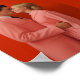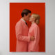 Foto minimalista de dos personas besándose con un traje rosado de fondo rojo