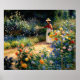 "In the Garden" es una vibrante representación de la vida al aire libre. La escena retrata un exuberante jardín lleno de flores florecientes, donde una sola figura disfruta de un ambiente tranquilo. La figura central, que a menudo se cree es Camille, la esposa de Monet, lleva una cesta de flores rodeada por una abundancia de flores de colores. El cuadro se caracteriza por su abundante utilización del color, de la luz desplegada y de la delicada interacción de la sombra y la luz solar, lo que crea una sensación de calidez y tranquilidad. El desprendimiento y la atención a los efectos de la luz sobre los elementos naturales reflejan un estilo impresionista, enfatizando la belleza de los momentos cotidianos de la naturaleza. Esta obra refleja la esencia de una tarde tranquila y soleada en un jardín, donde la vitalidad de las flores y el ambiente acogedor se combinan para crear un ambiente atemporal de relajación y satisfacción.