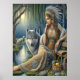 Bajo el resplandor tranquilo de la luna, una mujer serena descansa junto a un arroyo forestal, su elegante postura exuberante contemplación. Adorada con una alarida ornamentada y finura que hace eco de los bosques y sus intrincados patrones, comparte una comunión silenciosa con un majestuoso lobo gris. Como telón de fondo, las sombras de los lobos se mezclan con los árboles de crema dorada, creando una armoniosa fusión de espíritu salvaje y enriquecerse en paz.