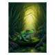 A vibrant frog is perched on a mossy log surrounded by tall grass and rocky terrain. The background is illuminated by a gentle light, casting a magical glow over the scene.