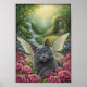 Adorable gray fairy cat with iridescent wings lounging amid pink roses in an enchanted garden with a waterfall and mossy arched stone doorway.