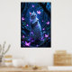 A fluffy tabby kitten sits in a magical forest at night, surrounded by many glowing purple butterflies, with soft light emanating from them. Clear details and vibrant colors enhance visual appeal.