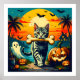 Este diseño capta una divertida aventura de Halloween: un inteligente gato tabby desfila orgullosamente a lo largo de un camino iluminado por la luna, aferrándose a un humero gigante en la boca. El telón de fondo es una ráfaga de colores retro al atardecer, lanzando sombras de palmeras y llenando el cielo con murciélagos animados. Alrededor, brillantes lámparas jack-o’, un caldero burbujeante, una casa embrujada y un fantasma amistoso prepararon el escenario para una travesura mágica. Es una celebración de curiosidad, misterio y humor inteligente —donde el bravucón felino y la ciencia se encuentran en un mundo festivo y encantador que invita a la risa y a la maravilla.