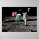 Un astronauta de APOLO y un alienígena con forma de pez están frente a frente en la superficie lunar con la bandera estadounidense al fondo. Un OVNI se cierne sobre ellos y la luna creciente es visible en la distancia.