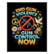 A bold, colorful protest-style illustration calling for peace and gun control, featuring a crossed-out rifle surrounded by symbols of unity and hope.