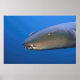 Enfermera a un tiburón con un pequeño chupón de tiburón dando un paseo en su cabeza. Belice