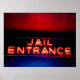 Luces de neón rojas que escriben la entrada de la cárcel iluminadas contra la pared de concreto.
