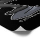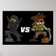 Black poster with a face off between pirates and ninjas. There is a black cartoon ninja who has two brown katanas in sheaths, crossing his arms and is standing on a rock. There is also a cartoon pirate who has a gray cutlass, an eye patch, a peg leg, a hook, a tattoo that says mom, a brown hat, a boot, a green button up shirt, khaki pants, a red with white spots bandana, a belt with gold buckle, and earrings standing on a treasure chest.
