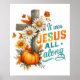 Un diseño pacífico y colorido con una escena otoño/otoño con calabaza, cruz de madera, mariposas y flores otoño. El colorido texto inspirador dice: "Fue Jesús todo el tiempo". Este diseño está disponible en una amplia variedad de productos.