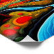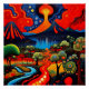 Una representación vívida y colorida de una erupción volcánica domina la escena con un cielo estrellado giratorio y flujos de lava estilizados. En primer plano, un río sinuoso serpentea a través de un paisaje salpicado de árboles redondeados y colinas onduladas, mientras que un cielo dinámico se desplaza por encima en atrevidos patrones