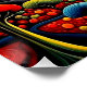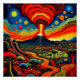 Una representación vívida y colorida de una erupción volcánica domina la escena con un cielo estrellado giratorio y flujos de lava estilizados. En primer plano, un río sinuoso serpentea a través de un paisaje salpicado de árboles redondeados y colinas onduladas, mientras que un cielo dinámico se desplaza por encima en atrevidos patrones
