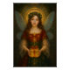 This enchanting piece depicts a beautiful fairy presenting a golden gift. She wears a red and green dress adorned with golden embroidery, her serene expression and iridescent wings radiating elegant grace and eternal fantasy. Perfect for lovers of fairy tales, fantasy art, and magical elegance. This artwork was generated by AI based on original human concepts.