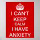 Inspirados por un antiguo eslogan poster británico de la Segunda Guerra Mundial, los diseños de "Keep Calm" están muy de moda y son populares. Este diseño de poster rojo parodia la frase original "Mantener la calma y continuar" y dice "No puedo mantener la calma tengo ansiedad". Esta es una visión divertida, graciosa y humorística del dicho original e incluye el gráfico de la corona blanca en la parte superior.