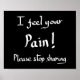 "¡Siento Tu Dolor! Por favor, dejen de compartir lo gracioso que siento tu dolor, cita sarcástica Chiste de humor poster blanco y negro. Una tipografía estrafalaria escrita a mano ideal para familia y amigos. Slogan manuscrito creado por The Sweetmans