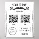 Este escaneo negro único para el poster de señas de pago es personalizable y la información de tu negocio es fácil de agregar **también como descarga instantánea**. Con 2 códigos QR puedes elegir venmo, paypal, cashapp o cualquier otra aplicación de pago para enlazar a tu cartel para que los clientes puedan pagar fácilmente por su compra. La colección de bigotes es más adecuada para las peluquerías y tiendas y marcas divertidas y lúdicas. Se trata de un estilo poster que se puede colocar en un pedestal, un marco, en la pared o como un poster plano sobre una mesa.