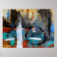 Explosión de color y diseño. El azul y el verde contrastan con los acentos de color blanco y negro, turquesa. La textura añade profundidad e interés a la pintura. Los movimientos se crean mediante el uso de líneas de movimiento y color. Los elementos negros verticales dan la sensación del contorno urbano.