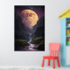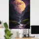 Este encantador poster captura un momento impresionante bajo el cielo nocturno, donde una magnífica luna dorada ocupa el centro del escenario, proyectando su luminoso resplandor sobre un paisaje sereno de montaña. La luna, imposiblemente grande y que irradia una luz suave y dorada, parece tener secretos del universo en su resplandor, iluminando la escena con un aura místico. Debajo, un suave arroyo serpentea a través del accidentado terreno montañoso, reflejando la luz etérea de la luna y realzando la mágica atmósfera de la escena. El cielo, pintado en profundos tonos morados, añade una capa de mística y asombro, creando un equilibrio armonioso entre lo celeste y lo terrenal. Este poster no es sólo una pieza de arte, es una puerta a un lugar tranquilo y de otro mundo donde la belleza de la naturaleza está en perfecta sintonía con el cosmos.