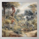 pintura vintage de una escena botánica con cebras en un oasis con palmeras y un río
