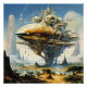 Una representación digital de una escena de ciencia ficción retro y vintage con una nave espacial.