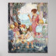 Una mujer con niños, niñas, un bebé, gatitos y un pájaro están junto a flores y una ventana, con una vista de un barco de vela. ¡Un mundo idílico de seguridad y comodidad!