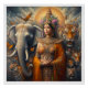 La obra representa una escena poderosa y mística que mezcla elementos de espiritualidad, mitología y naturaleza. La figura central exuda una sensación de serenidad y fortaleza, mientras que los animales circundantes añaden al aura general de poder y mística. Figura central La figura central parece ser una diosa o deidad, adornada con intrincadas joyas doradas y una expresión serena. Su cara medio sombría podría simbolizar la dualidad o la conexión entre diferentes reinos. Su suave interacción con el cachorro tigre sugiere compasión y armonía con la naturaleza. Elementos simbólicos Elefante: A menudo simboliza sabiduría, fuerza y buena fortuna en muchas culturas. Tigre: Representa poder, coraje y protección. Joyas doradas: significa divinidad, riqueza y estatus. Fondo más oscuro: Crea un sentido de misterio y enfatiza la figura central y los animales.