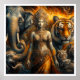 La obra representa una escena poderosa y mística que mezcla elementos de espiritualidad, mitología y naturaleza. La figura central exuda una sensación de serenidad y fortaleza, mientras que los animales circundantes añaden al aura general de poder y mística. Figura central La figura central parece ser una diosa o deidad, adornada con intrincadas joyas doradas y una expresión serena. Su cara medio sombría podría simbolizar la dualidad o la conexión entre diferentes reinos. Su suave interacción con el cachorro tigre sugiere compasión y armonía con la naturaleza. Elementos simbólicos Elefante: A menudo simboliza sabiduría, fuerza y buena fortuna en muchas culturas. Tigre: Representa poder, coraje y protección. Joyas doradas: significa divinidad, riqueza y estatus. Fondo más oscuro: Crea un sentido de misterio y enfatiza la figura central y los animales.